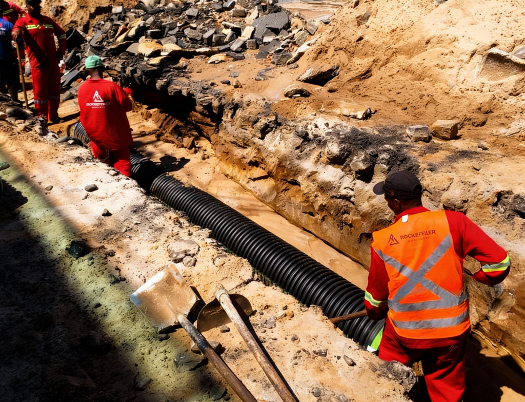 Equipe Rockefeller realizando a escavação para implementar o sistema de drenagem.