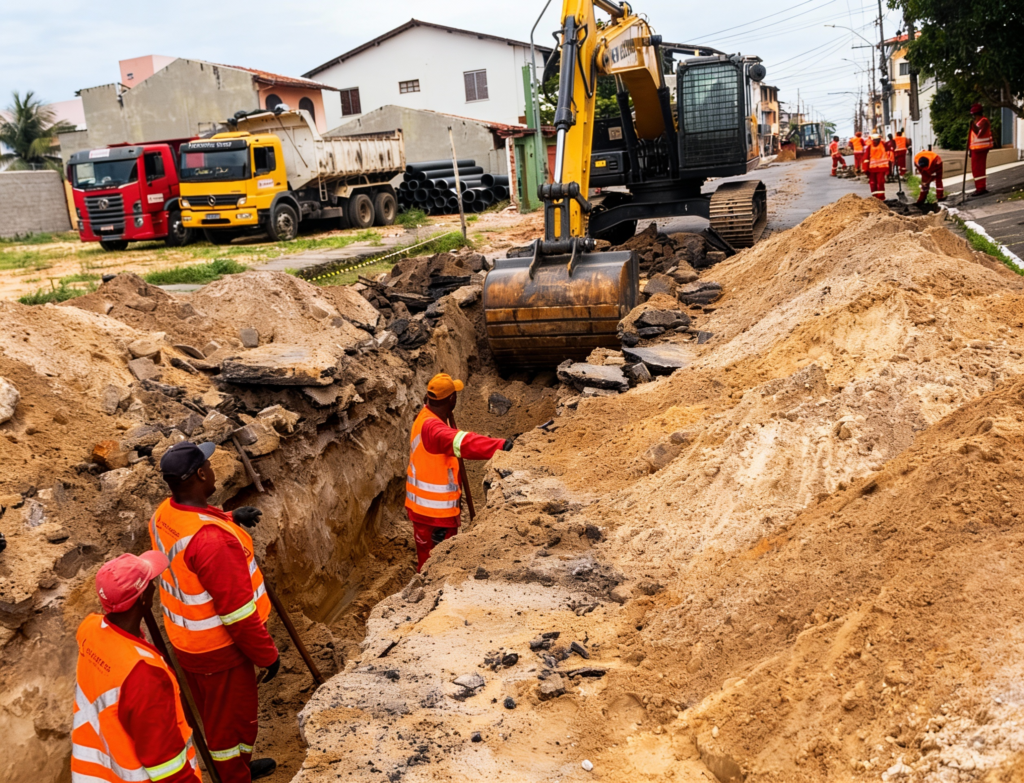 Um dos principais diferenciais da obra foi a implantação de um sistema de drenagem eficiente, projetado para captar, conduzir e direcionar corretamente as águas pluviais. Foram executados serviços como abertura de valas, instalação de tubulações, caixas de captação e dispositivos de escoamento, reduzindo significativamente o risco de alagamentos, erosões e danos ao pavimento ao longo do tempo. Essa etapa é essencial para a longevidade da obra, pois garante que a água não comprometa a base e a sub-base da via, preservando a estrutura e diminuindo a necessidade de manutenções corretivas futuras.